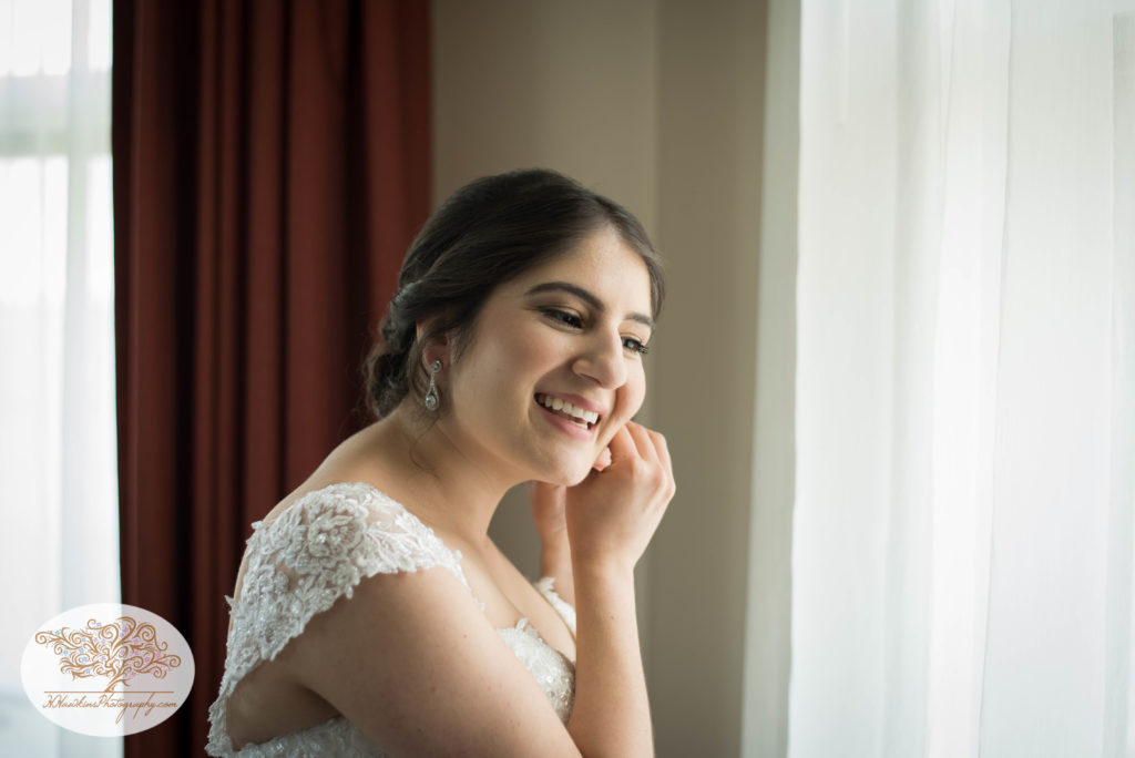Melissa and her bridesmaids got ready right at Belhurst Castle in a room that overlooked the lake. Melissa even got a sneak peek of her groom through her window as the groomsmen were outside on the lawn doing photos with Andrew!