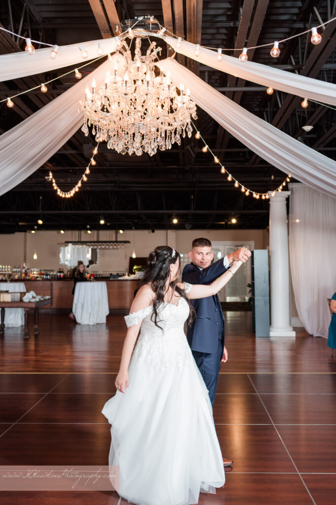 The White Room reception space was draped so beautifully, with chandeliers and bistro lights creating a warm, romantic glow.